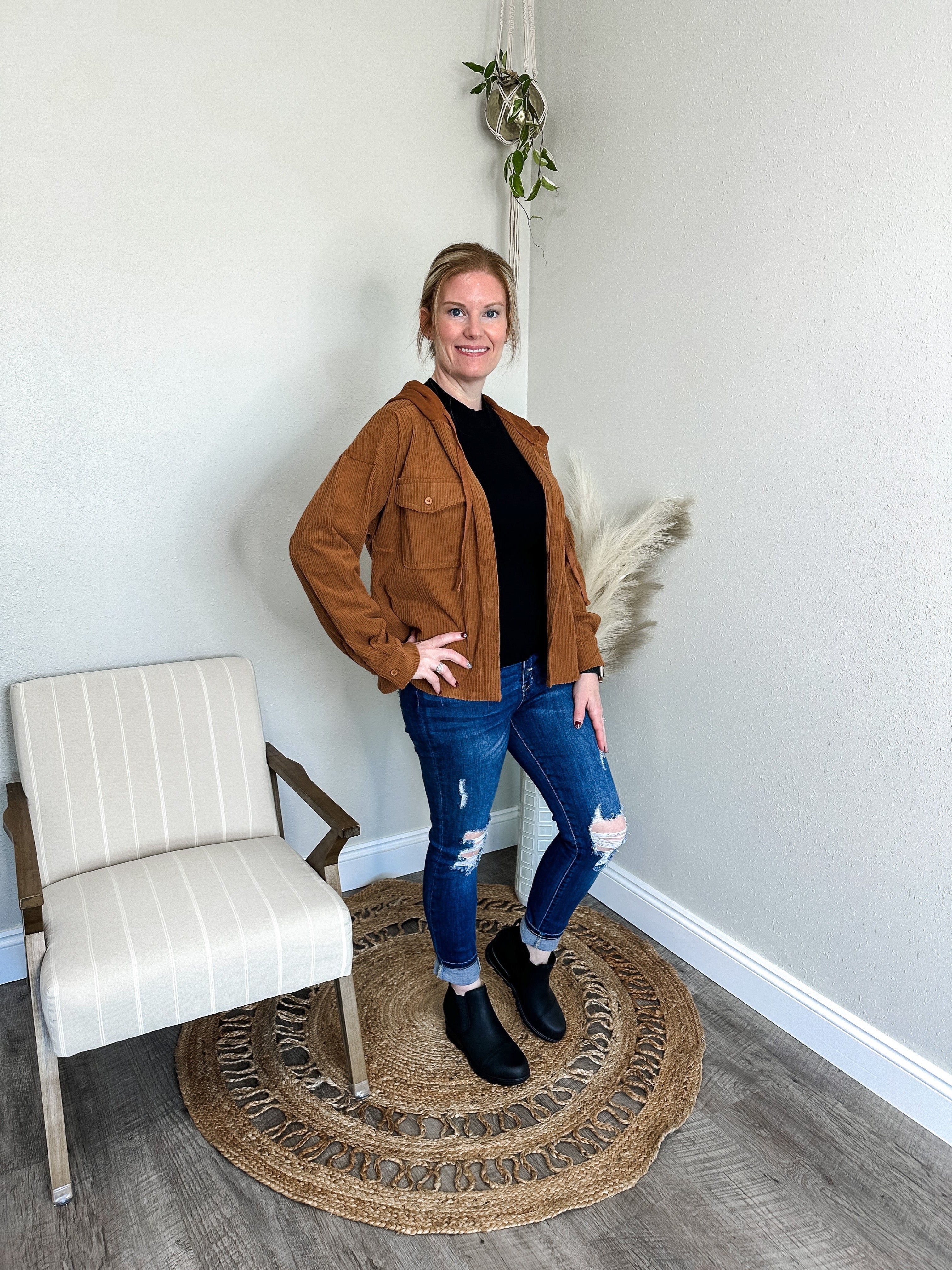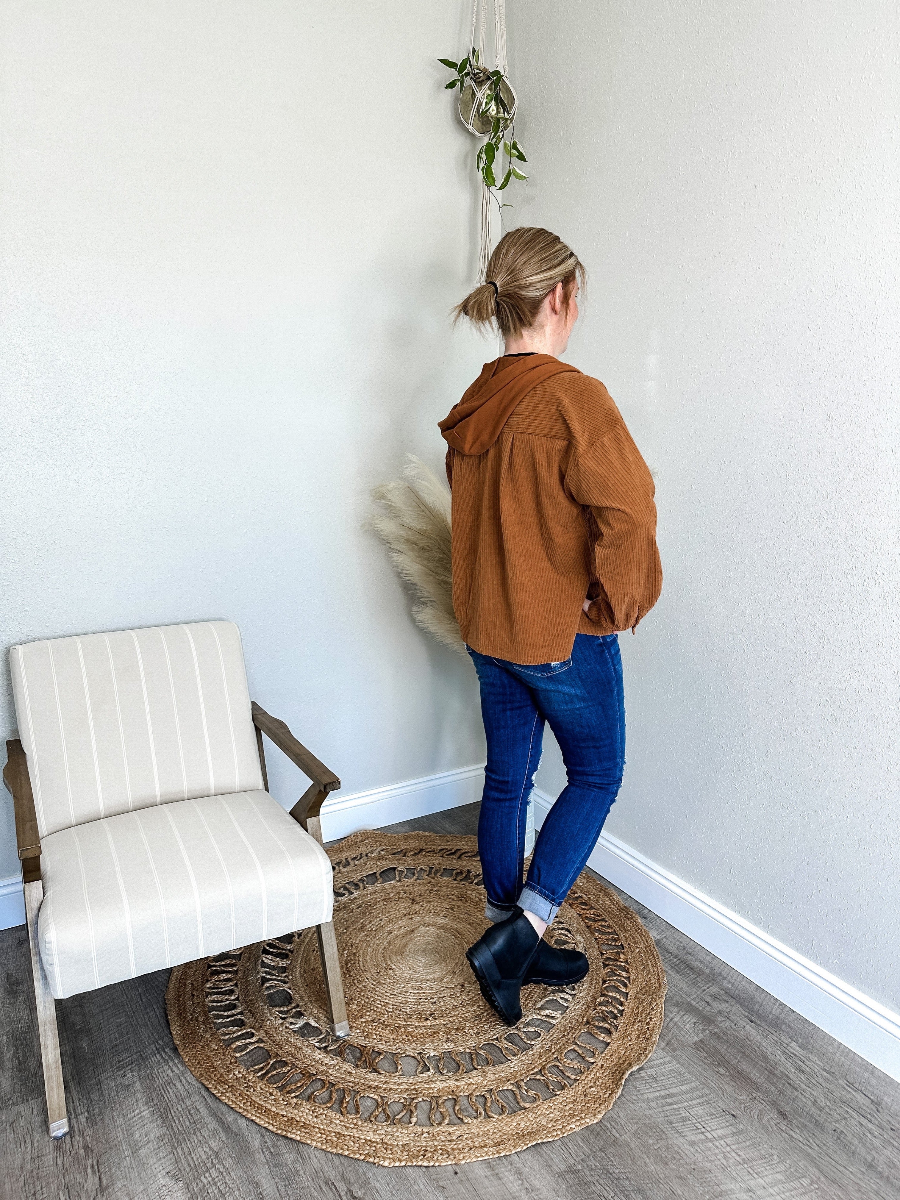 Solid corduroy hooded casual jacket with button down front, dropped shoulder and pockets.
