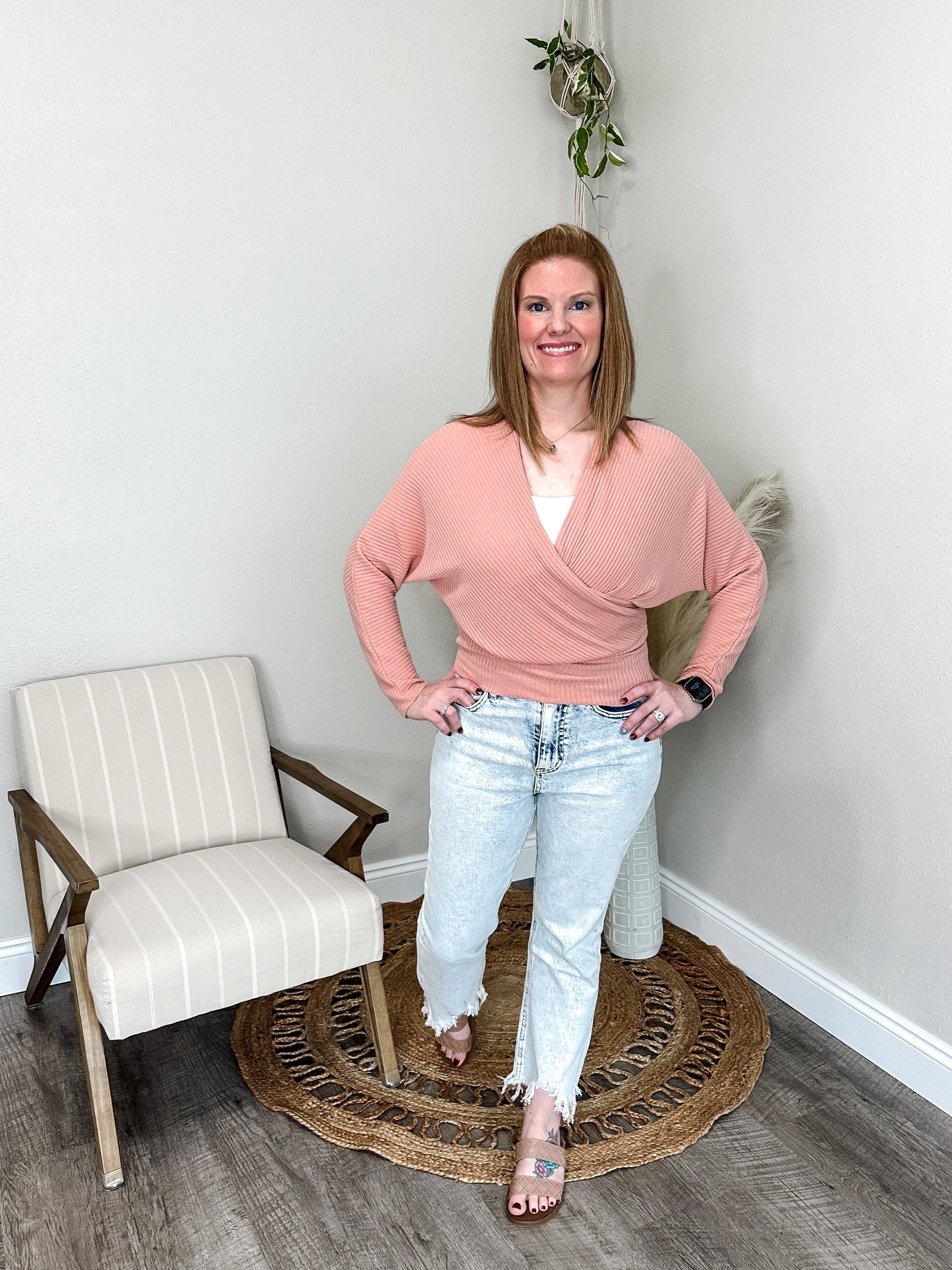 Ribbed long sleeve wrap top with a band around waist. You can wear a cami under or not! Pair with the Kallie Cami. Perfect top to dress up!