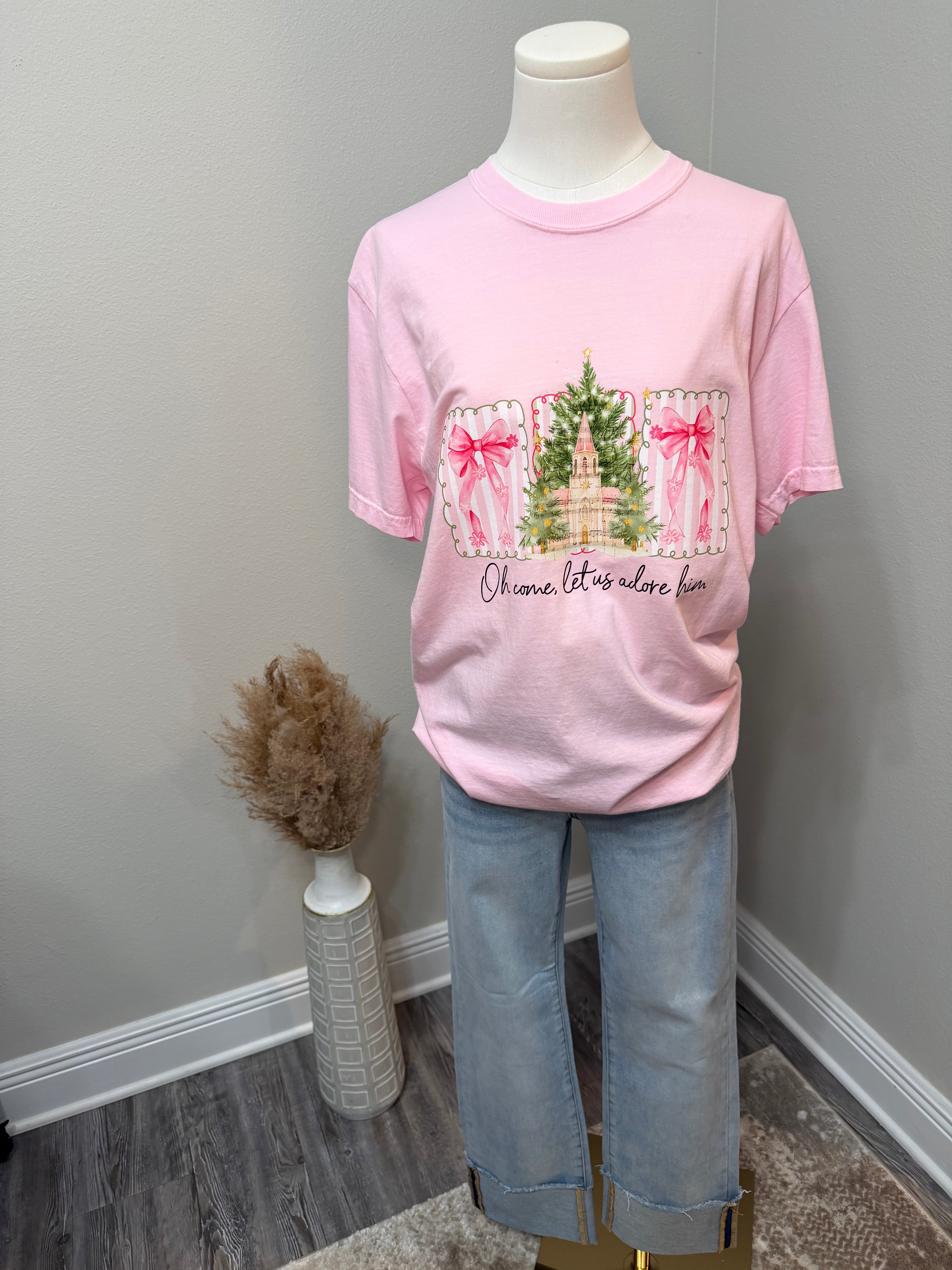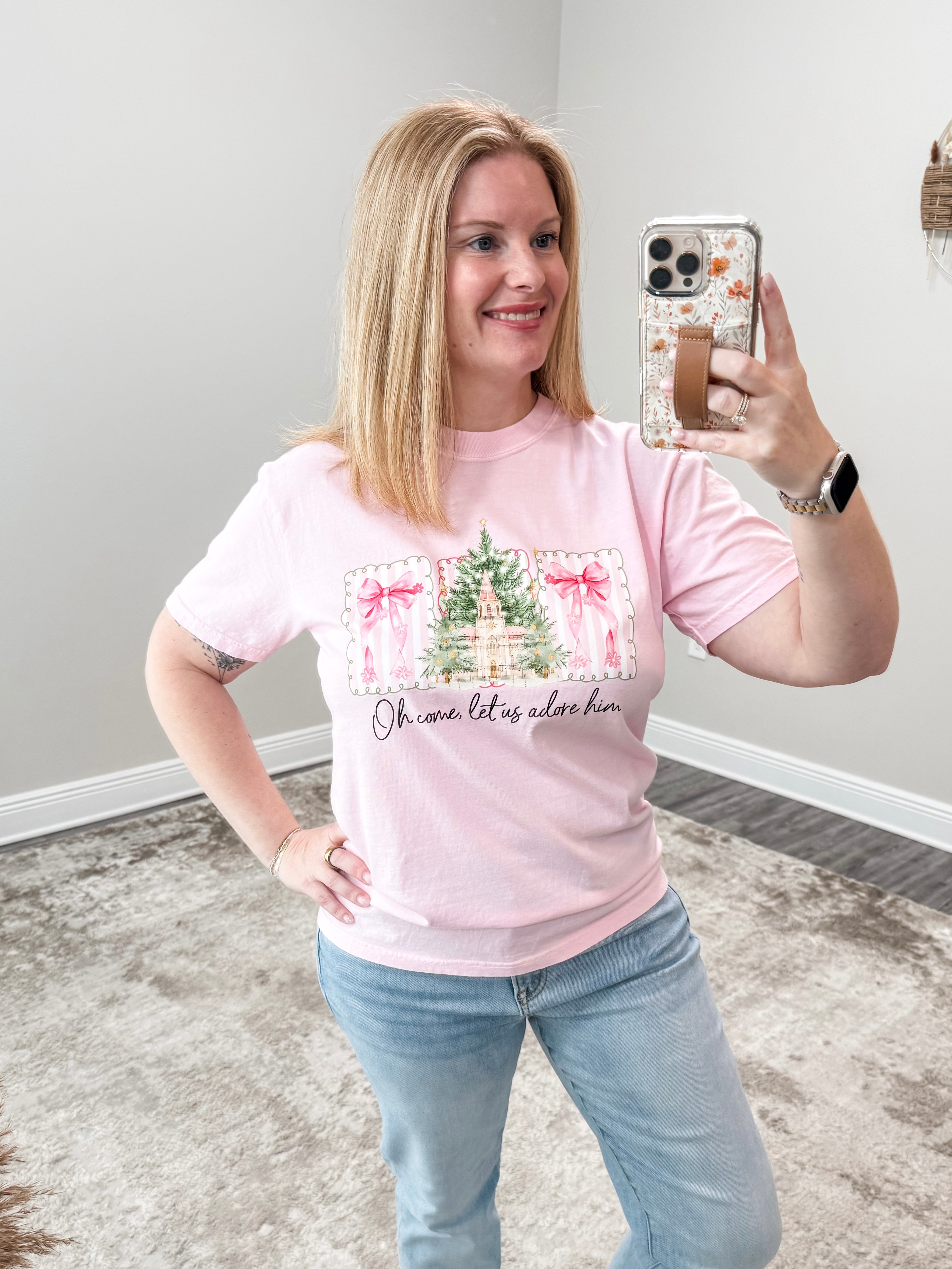 Celebrate the season in style with this soft pink Comfort Colors tee featuring the beloved hymn "Oh Come Let Us Adore Him." The relaxed fit and premium fabric provide all-day comfort, while the meaningful graphic makes a thoughtful statement of faith. Perfect for holiday gatherings, casual wear, or as a gift for anyone who cherishes timeless spiritual messages. Elevate your seasonal wardrobe with this versatile piece that combines comfort with purpose.