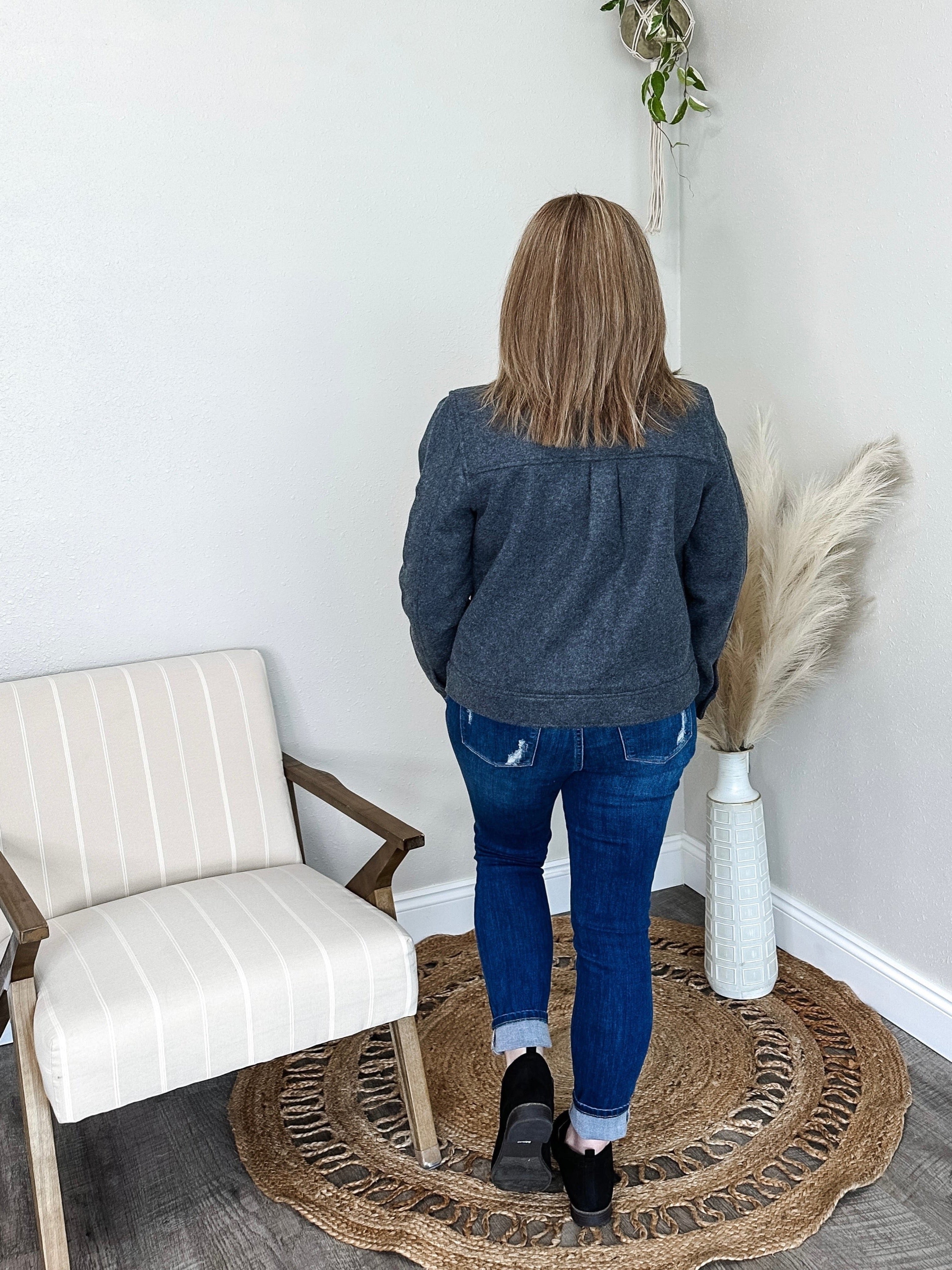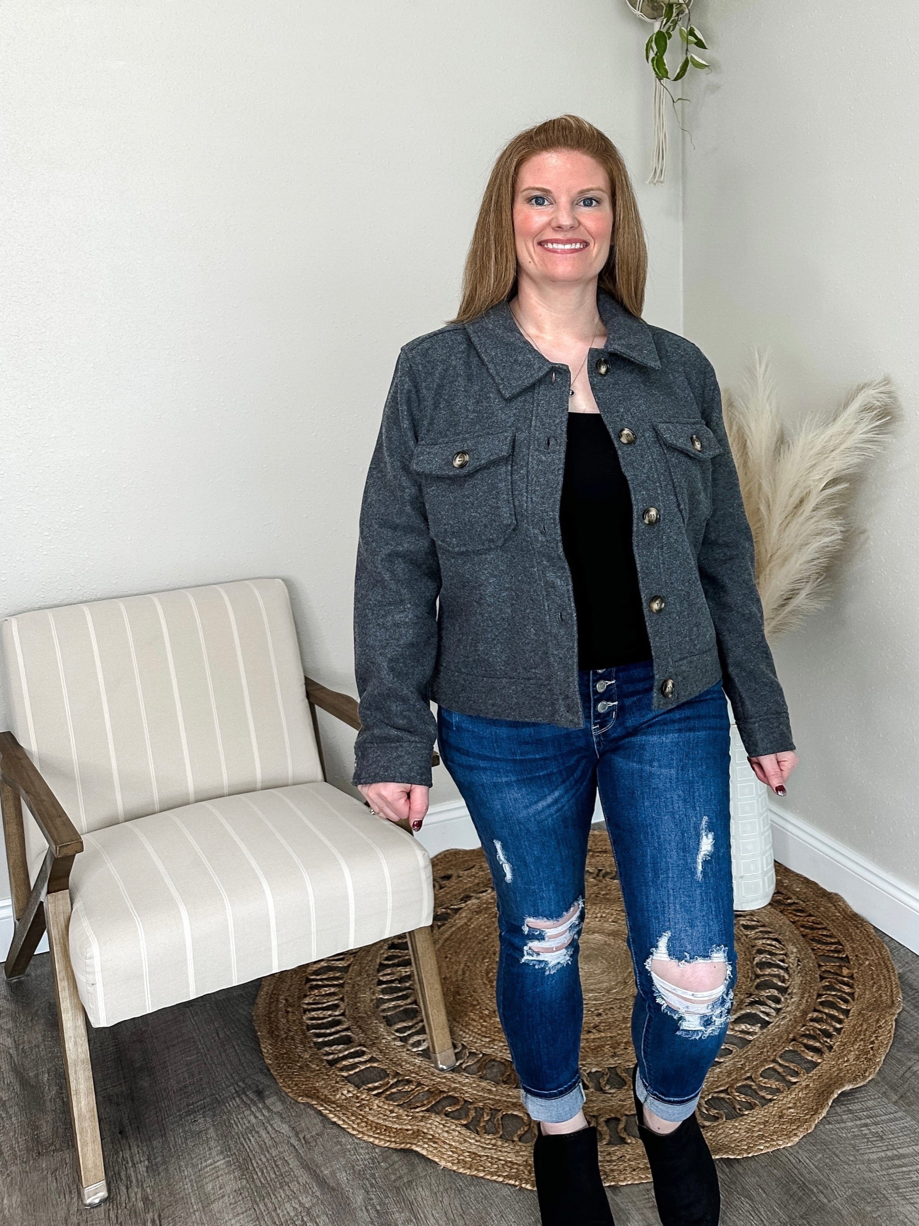 Structured cropped shacket with button down front, chest pockets and a clean straight Botton.  It's a very stylish layering piece with cute seam details.