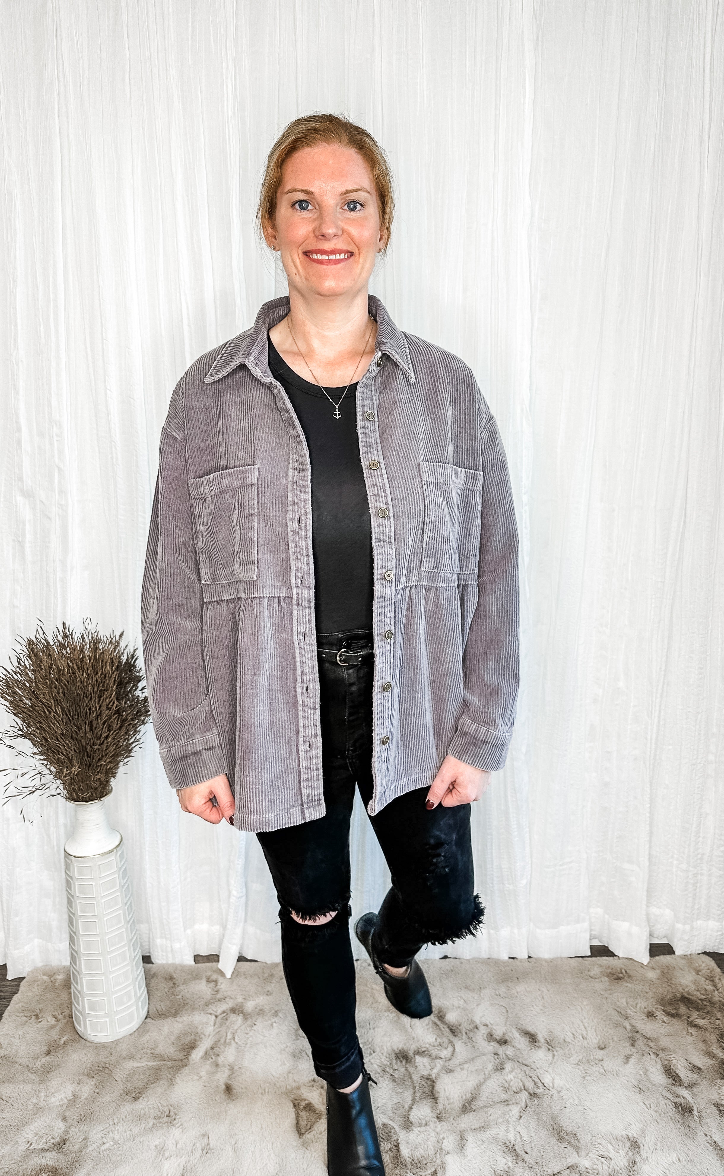 Mineral washed corduroy button down shirt with two front pockets. Perfect for everyday wear in the fall!