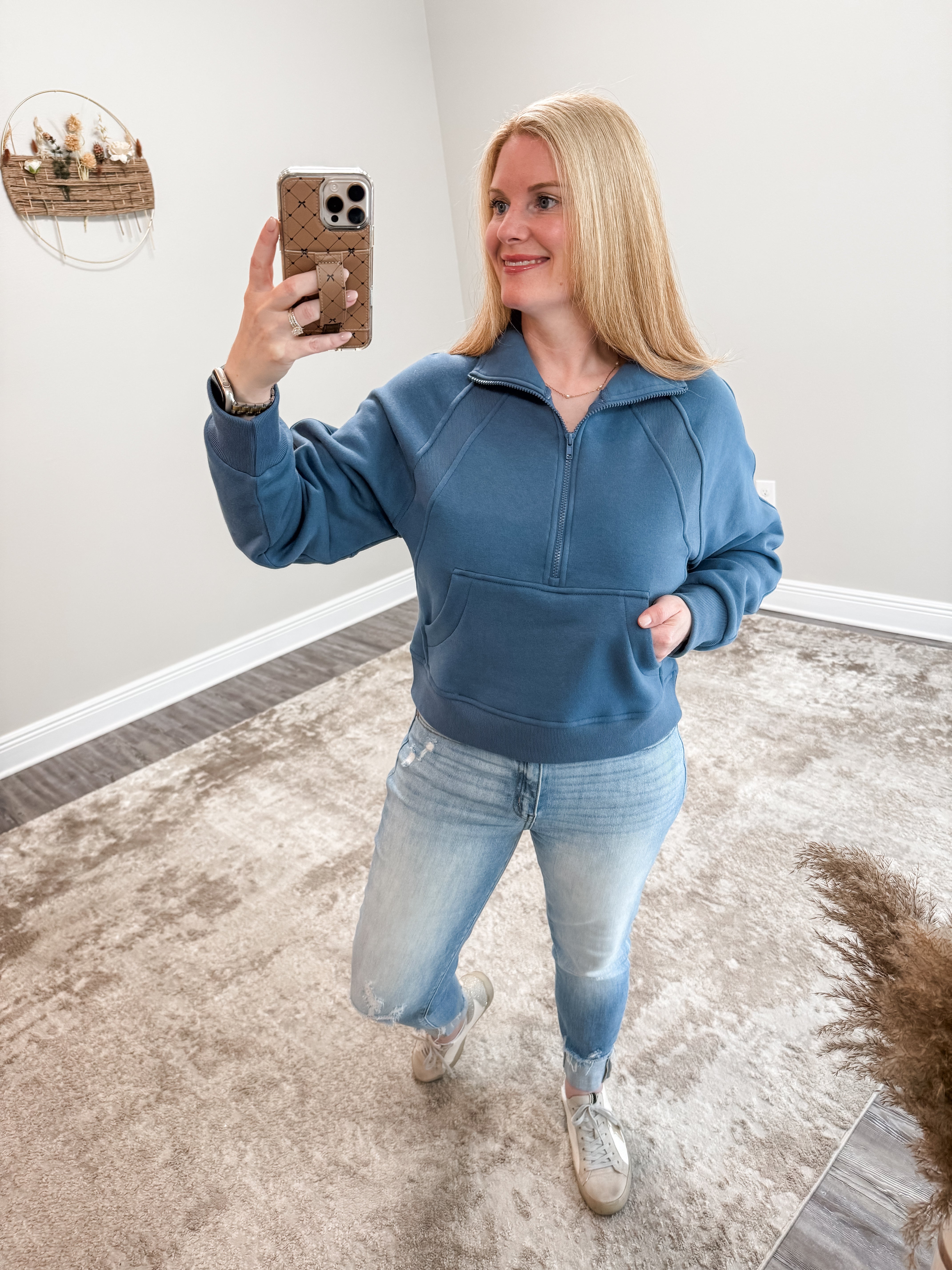 Introducing the Dusty Blue Miley Sweatshirt - the perfect combination of style and comfort. Made with soft fleece material, this sweatshirt features a convenient half zip and a spacious kangaroo pocket. Stay cozy and stylish in the Jade Miley Sweatshirt!