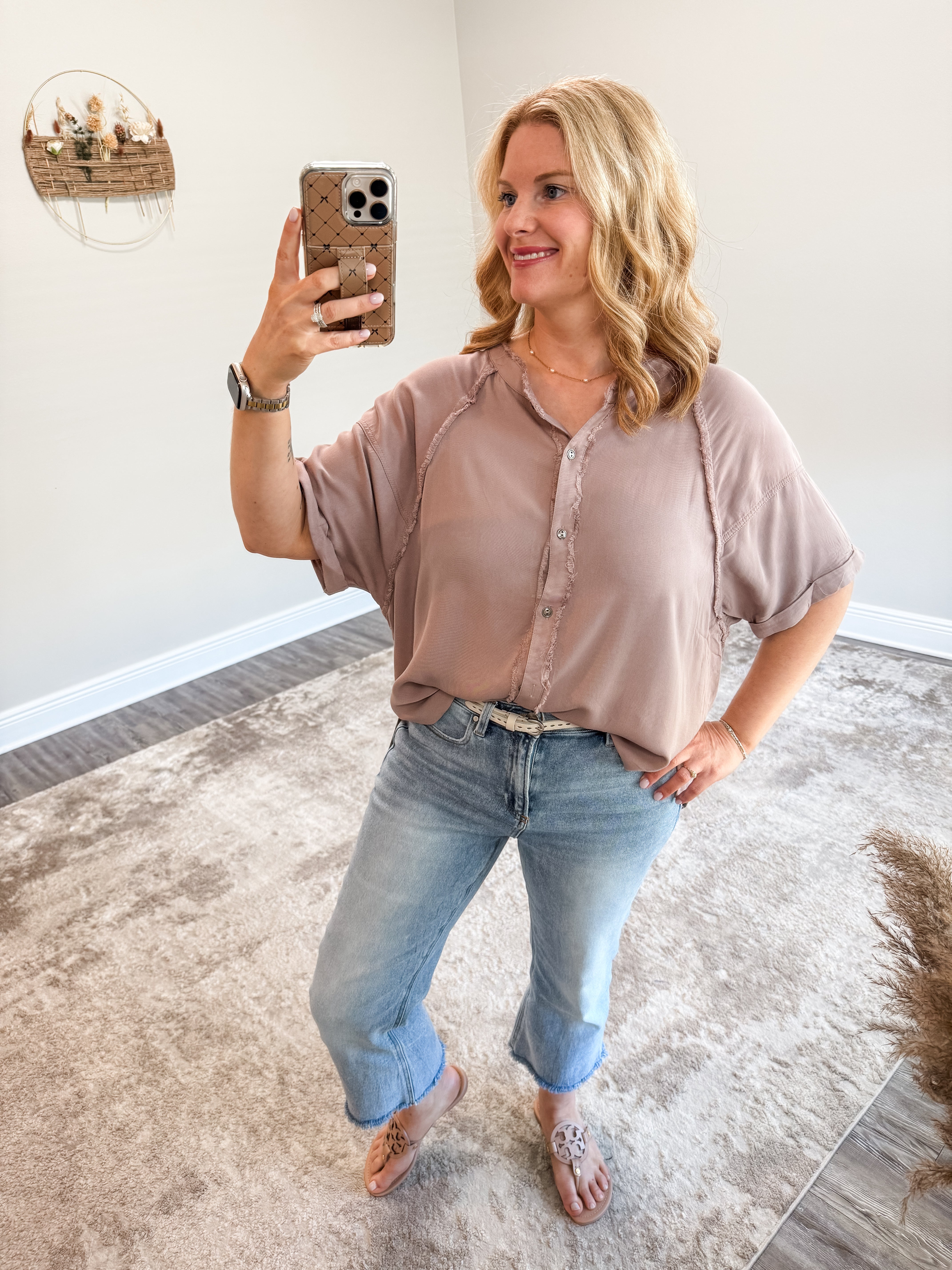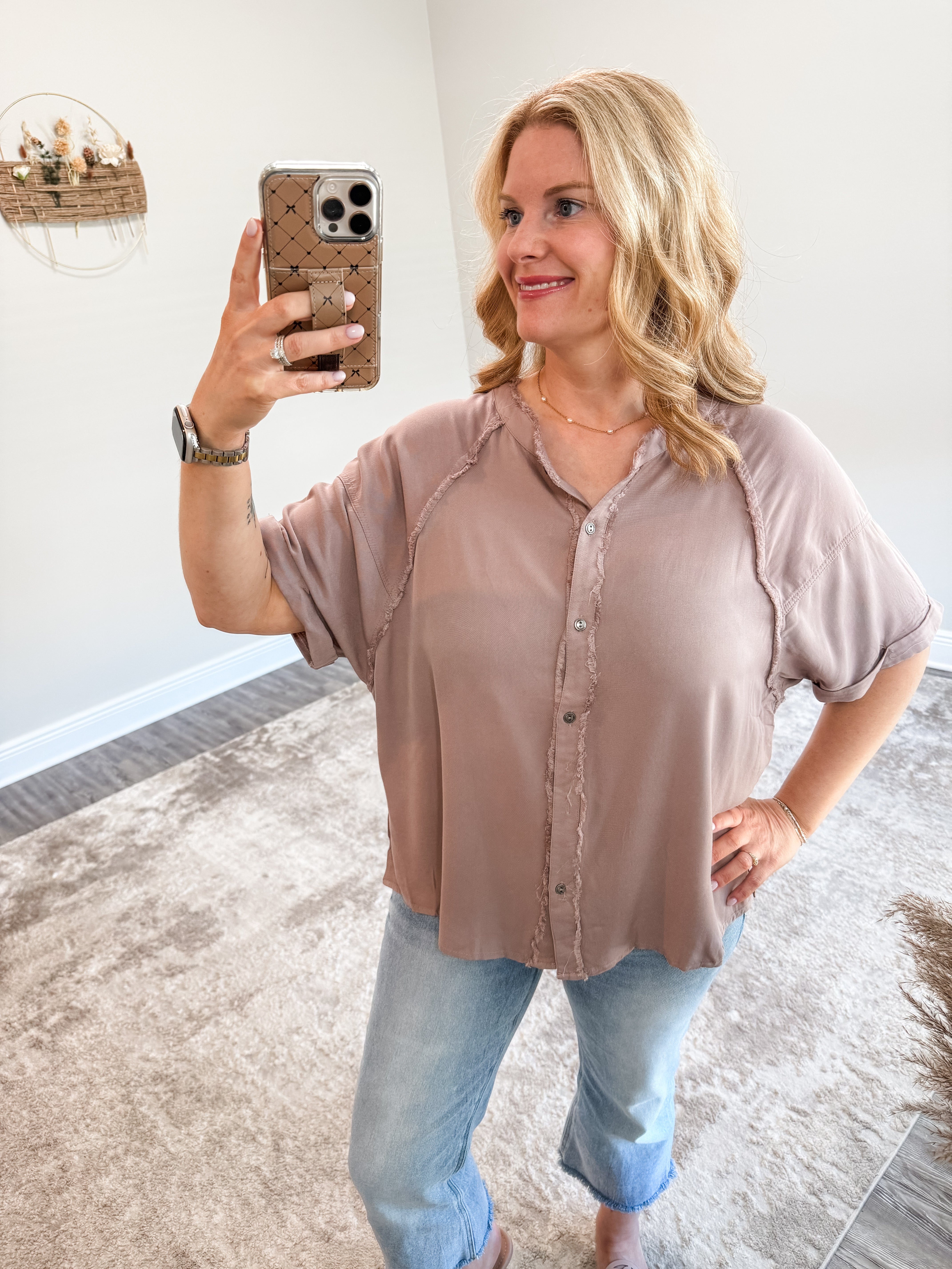 Introducing the Hannah Freyed Button Down Top - a solid half sleeve blouse with a frayed round neckline and button down front. With added pinching in the back, frayed seams for detail, and two side slits for breathability, this high-low design is both stylish and practical. Elevate your wardrobe with this must-have piece!