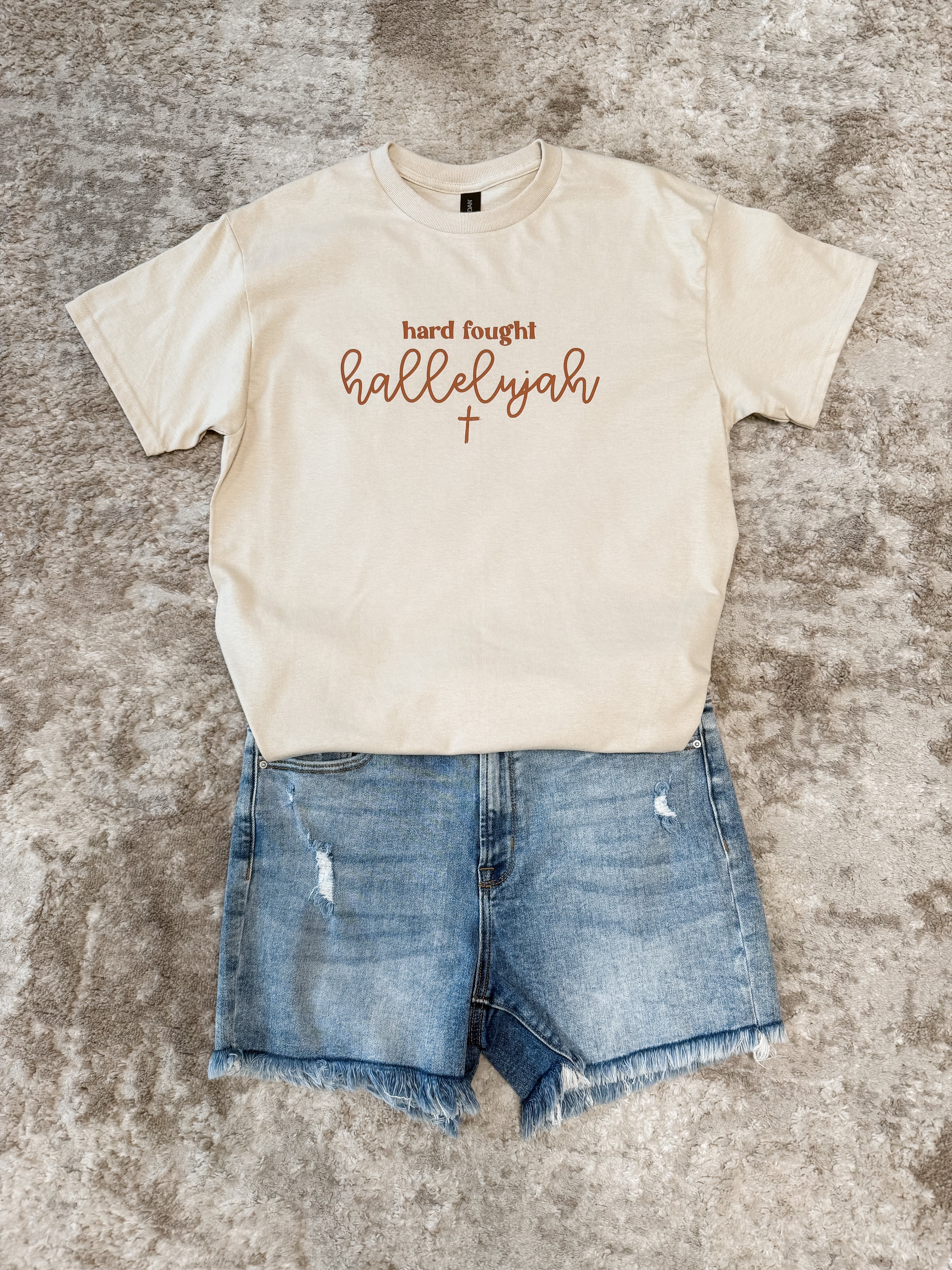 Show off your love for Jesus with our Hard Fought Hallelujah Tee! This comfortable and stylish shirt is perfect for pairing with jeans or shorts. Spread the positive message with this must-have tee.