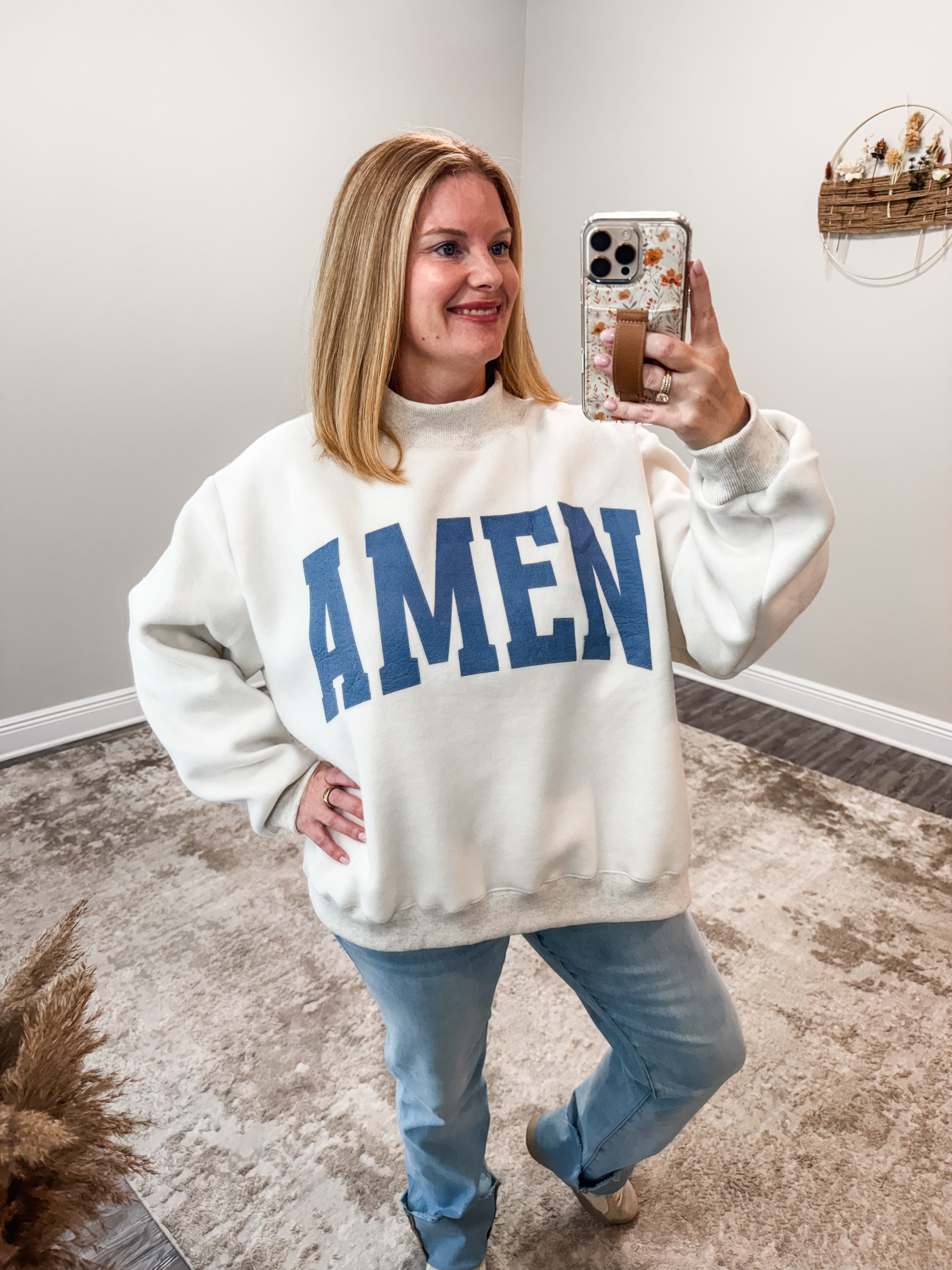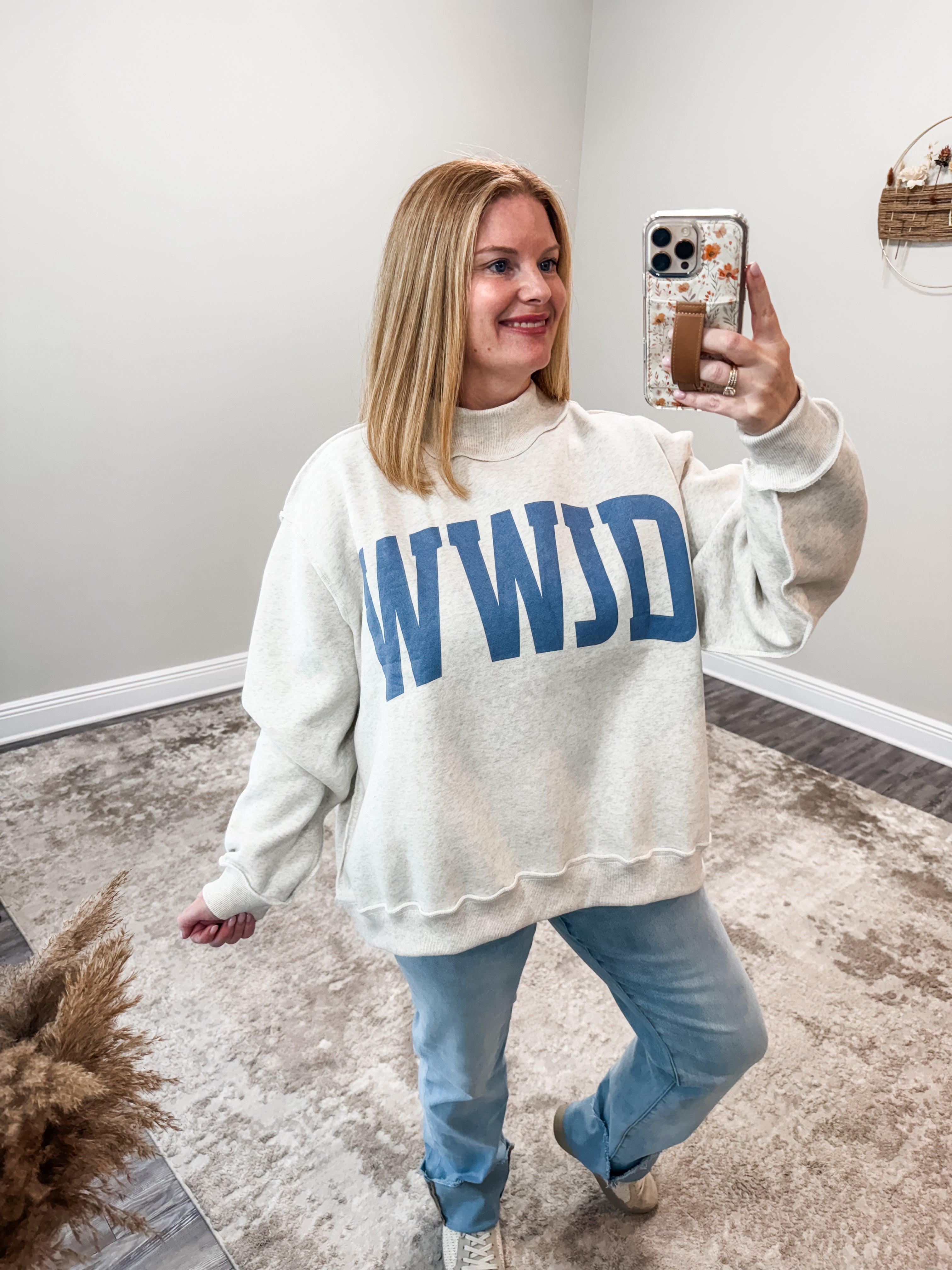 Experience the ultimate cozy versatility with the Amen/WWJD Reversible Sweater. Crafted from the softest fleece, its oversized fit and drop shoulder design ensure comfort all day long. The mock neck adds a stylish touch, while rib banded hemline and cuffs keep the fit snug. Switch up your look effortlessly with the reversible design, featuring bold "WWJD & AMEN" prints on each side—perfect for expressing your faith with flair. Embrace warmth, comfort, and style in one unique sweatshirt.