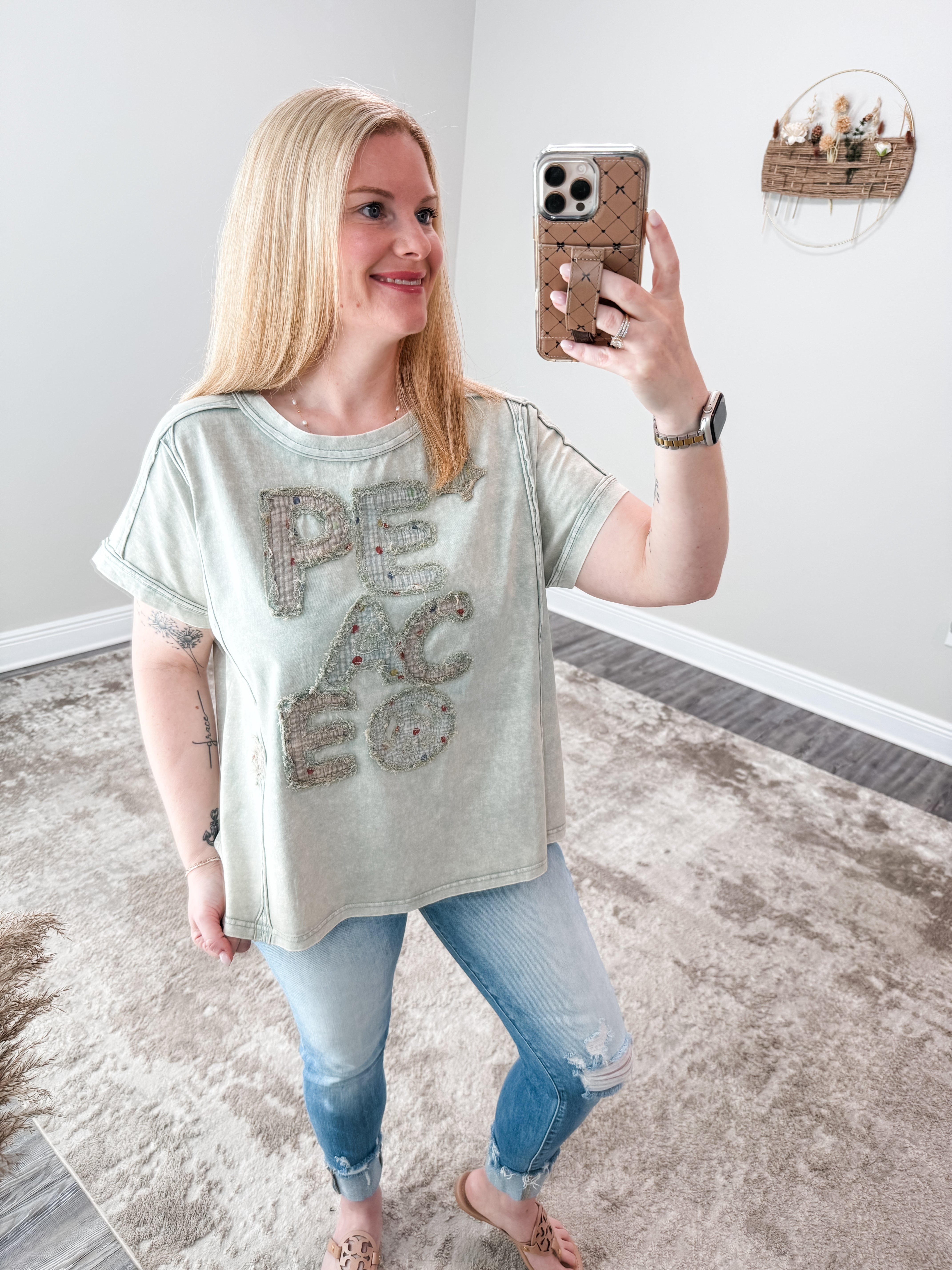 Express your peaceful and carefree spirit with our Peace Sign Lettering Patchwork Top. Made from lightweight cotton knit fabric and featuring a mineral wash for added softness, this top is perfect for casual days. The round neck, short sleeves, and relaxed fit add comfort, while the side slit and raw cut edge seam detail add a touch of bohemian style. Spread positivity and spread the love with this unique piece.
